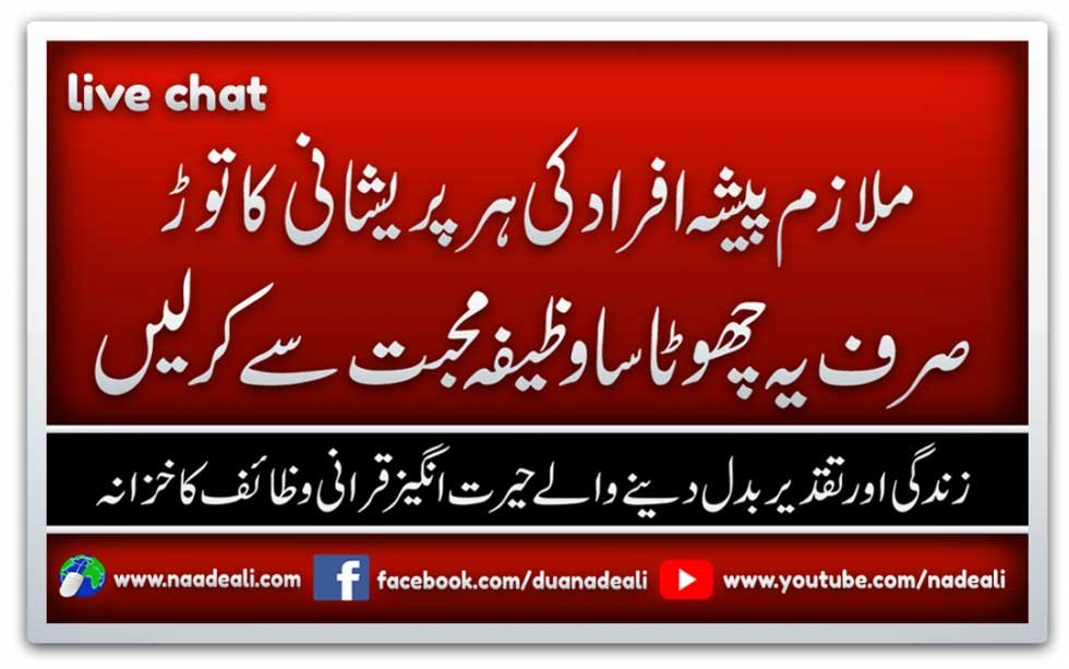 اگر کوئی بہن یا بھائی بیان کیا گیا وظیفہ نہ کر سکیں یا انہیں وظیفہ کرنے سے ناکامی ہوتی ہو تو وہ جلد اچھی نوکری حاصل کرنے کےلئے آستانہ سے اسم اعظم شریف کا عربی نقش منگواء کر اپنے پاس رکھیں یا اپنے گھر میں رکھیں ۔ انشاء اللہ اس نقش کی برکت سے آپ کونوکری کی بندش اور روکاوٹ سے فوری نجات حاصل ہوجائے گی اور آپ کو آپ کی پسند کے مطابق اچھی نو کری نہ صرف جلد حاصل ہوجائے گی بلکہ اس نو کری میں آپ کو اللہ کے کر م سے ترقی بھی ملتی رہے