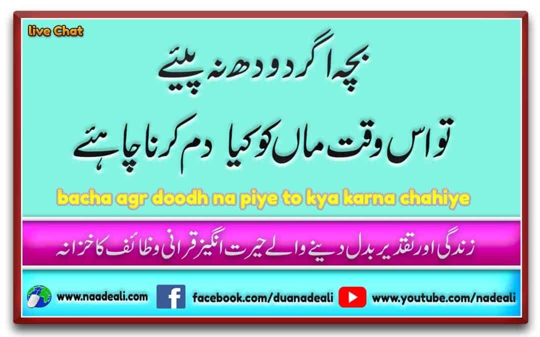 Iss post mein aap ko bataia gya hai k bacha agr doodh na piye tu kya dua vird karne chahyia , aur iss k ilawa bacha agr doodh na piye tu iss k liye dam kya hai aur iss k liye kiya permanant taweez ho sakata hai . Lahaza bacha agr doodh na piye tu iss ka rohani ilaj ki mokammal urdu detail nechay darj hai .
