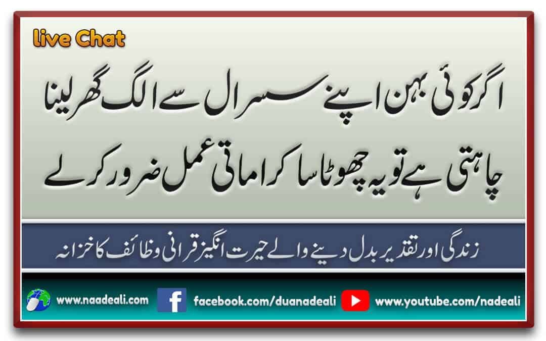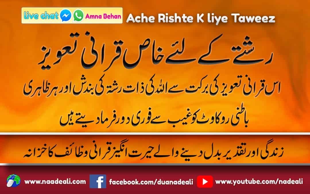 Bismillah ka mushkil kusha taweez aap ke tamam mushkilat ka wahid واحد rohani hal hai . Jis ke barkat se aap k tamam masail asy hal ho jayen gay k aap khud bhe heraan reh jayen gay. Aaj k waqt mein log bhut maslo ka shikaar hain aur es se nijat ka asa amal bhe chahty hain . Jis ko karne se unnye hamesha k liye apni parshani se nijat mil jaye. Bohut se logo ka maqsad job ka hasool hai. Kch logo ko shadi k na hone , rishta na milne jasy masail ka samna hai . Baz log job interview ko pas karna chahty hain aur karobar rizq mein barkat tu har insaan ki khawaish hai . Agar ap in tamam parshaniou ka hal chahty hain. Tu in masail se nikalne ka hal bismillah ka mushkil kusha taweez hai . Es liye aap ye taweez apne pas aur apne ghar mein zaroor rakhen .