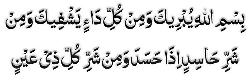 نبی اکرم صلی اللہ علیہ وسلم کی اہلیہ حضرت عائشہ صدیقہ رضی اللہ تعالیٰ عنہا سے روایت ہے ، انھوں نے کہا : جب نبی اکرم صلی اللہ علیہ وسلم بیمار ہوتے تو جبریل علیہ السلام آپ کو دم کرتے ، وہ کہتے : ” اللہ کے نام سے ، وہ آپ کو بچائے اور ہر بیماری سے شفا دے اور حسد کرنے والے کے شر سے جب وہ حسد کرے اورنظر لگانے والی ہر آنکھ کے شرسے ( آپ کومحفوظ رکھے ۔ ) “