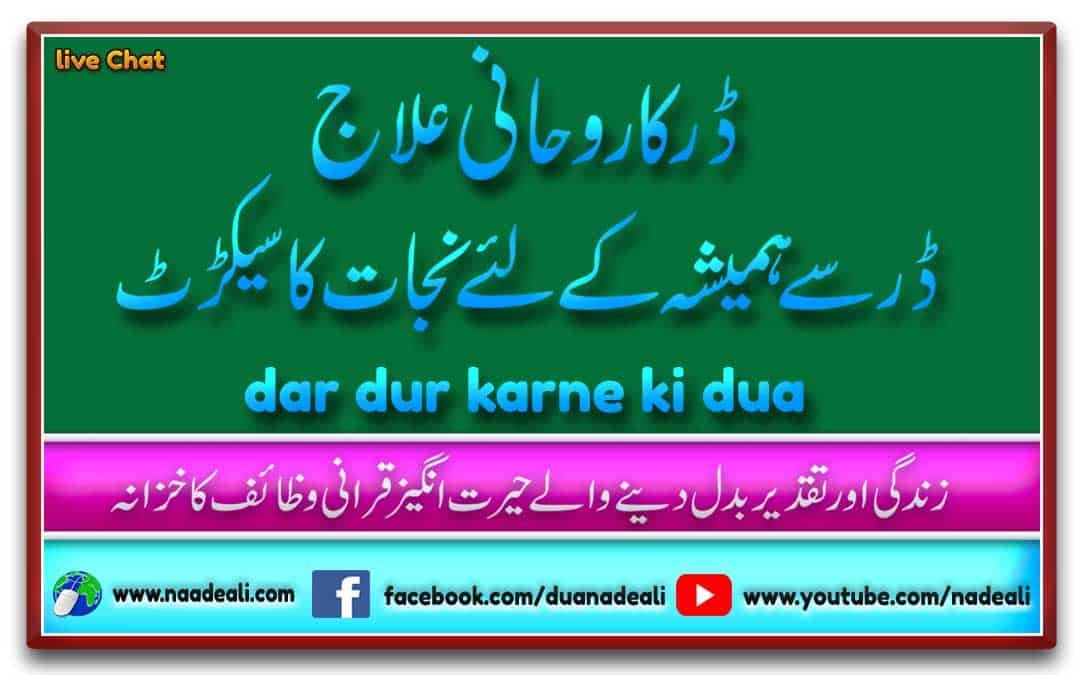 Dar dur karne ki dua naade ali sharif ki barkat se aap har kisam k dar aur khauf se hameesha mehfoz reh saktay hain . Dar aik aysa masla hai ju har fard mein kisi na kisi andaz mein mojood hai . Koe fard bohat zaida darta hai aur koe kam . Dar ki waja nafsiyati bhe ho sakti hai aur rohani bhe . Nafsiyati dar ka ilaj medicine se ho sakta hai , likan ager dar ki waja rohani hai tu iss ka ilaj asaan nahi . Aur yad rakhne wali baat ye bhe hai k ager aap k dar ki waja rohani hai tu iss ka dair se ilaj karna aap k liye nuqsan ki waja ban sakta hai .