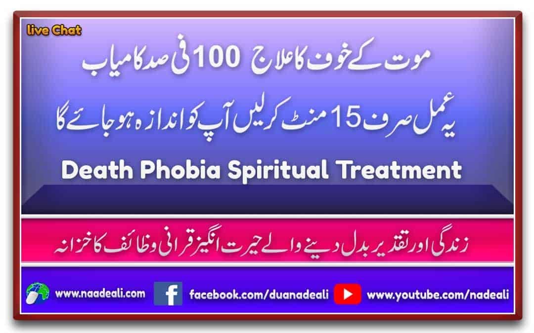 Death phobia ka spiritual treatment dua naade ali shareef mein hai aur dua nad e ali shareef se insan ka har kism ka fear sirf chand lamhat mein khatam ho jata hai . Death phobia se murad mout ka khauf hai . Death phobia aik aysi nafsiyati bimari hai jes mein kisi fard k dil mein mout ka dar paida ho jata hai , iss bimari mein mariz ko lagta hai k wo kuch dair mein mar jae gha . Death phobia ko death anxiety aur thanatophobia bhe kaha jata hai . Death phobia mein mareez ka mout aane k hawalay se dar itna pukhta hota hai k baz oqaat iss ka dar iss k liye haqeeqat sabat ho jata hai . Death phobia bohat common disorder hai . Es disorder ka shikaar bohut se log hain aur har saal ye marz hazarun logo ko hota hai. Death phobia ki waja aam tor par horrior movies , bachpan mein suni ghe horrior kahaniyan aur bachapan mein kabristaan ya kisi aysi jagha ka dar hai jahan kisi ka intikal howa ho .