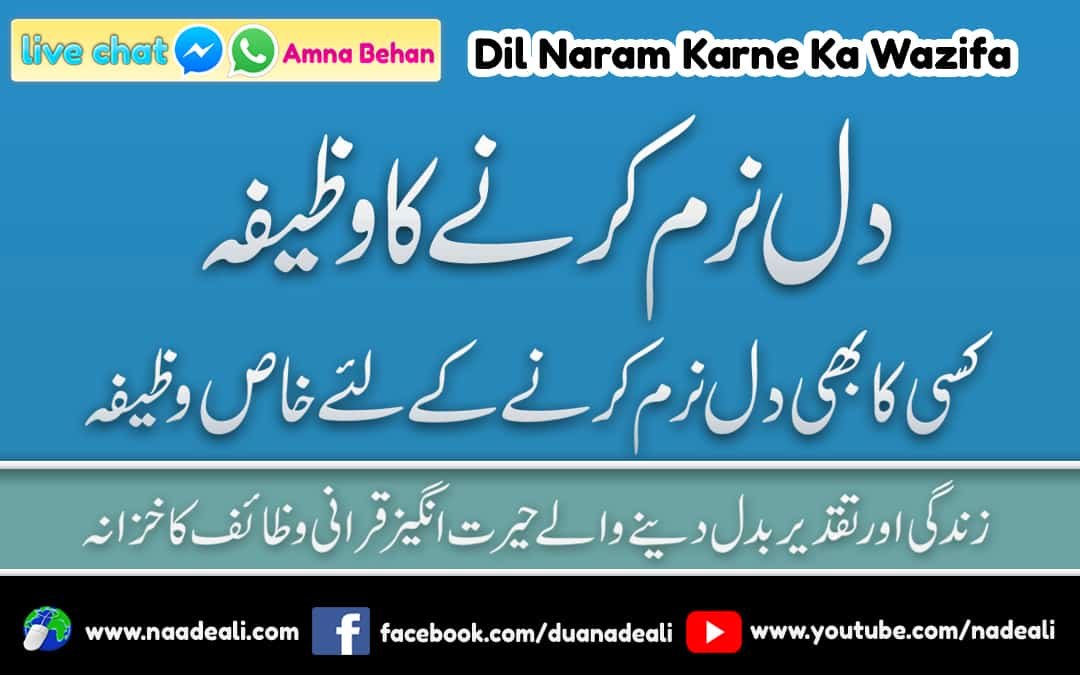 Dil naram karne ka wazifa dua naad e ali ki barkat se aap shohar , biwi , aulad , walidain , dushman ya kisi fard ka dil apne liye naram kar sakte hain . Dil naram karne ka ye wazifa har fard k dil mein aap ki izat aur mohabbat paida kar de gha insha allah . Baz afrad ki kismat aysi hoti hai k har koe inn se bilawaja hi nafrat karta hai . Ye logh agr koe acha kaam krain tu logh inhay bewaqauf kehne lagh jatay hai , kisi se naiki krain tu logh iss naiki ka badla inhay badi mein detay hain . Iss k ilawa family ka har fard inn ki had se zaida mukhalfat karta hai . Aysay afard halat aur apno k be had sataye huye hotay hain . Inn k pass mal nahi hota jes ki waja se logh inn ki izat bhe nahi kartay . Lahaza aysay afrad agr moashray mein apni izat , kamyabi aur wafar dolat hasil karna chahtay hain tu inn k liye dua naade ali sharif ka khas amal peesh kar diya hai . Dua nade ali ka amal mohabbat se kar lain insha allah aap ko family aur friends ki mohabbat hasil ho jae ghe . Ye amal karne k baad aap jes se baat krain ghay iss ka dil aap k liye naram ho jae gha .