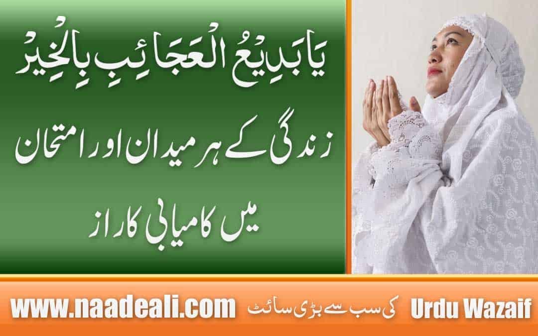 Imtihan mein kamiyabi ka daro madar sahi mehnat aur uske baad dua par hai. Asal mein sahi mehnat hi dua hai. Lekin baz students sahi mehnat karte hain lekin exams ke qareeb unko aksar depression lahaq ho jata hai, jiski wajah se who sahi se exam nahi de pate aur nakam ho jate hain. Isi liye agar koi student yeh chahta hai ke use imtihan mein kamyabi hasil ho jaye to who rozana 100 martaba Ya Badi ul Ajaib Bil Khair یا بدیع العجائب بالخیر wird karne ki adat daal lein aur imtihanat ke nazdeek aap yeh dua mubarak sirf 10 martaba wird kiya karein. Is ke ilawa aap study mein sara saal mehnat karein aur biyan ki gayi dua mubarak bhi wird karte rahen. Lekin exams ke nazdeek aram karne par bhi tawaja dein. InshaAllah aap ko zindagi ke har maidan, lexam aur interview mein hamesha kamyabi milti rahegi.