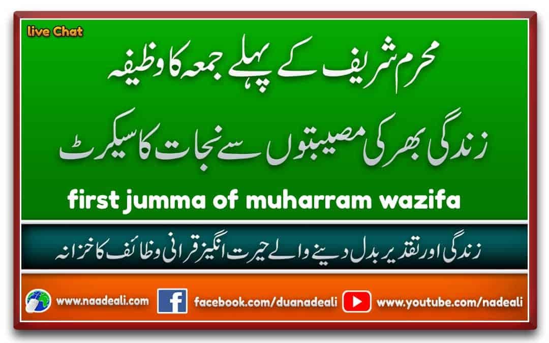 wazifa yani muharram ka pehla پہلا jumma mein agr ap  Dua Naade Ali sharif wird ورد kar letay لیتے hain tu ye aik din ka wazifa ap ki zindagi bhar بھر ki pareshanio پریشانیوں ka gaibi غیبی rohani hal حل hai .