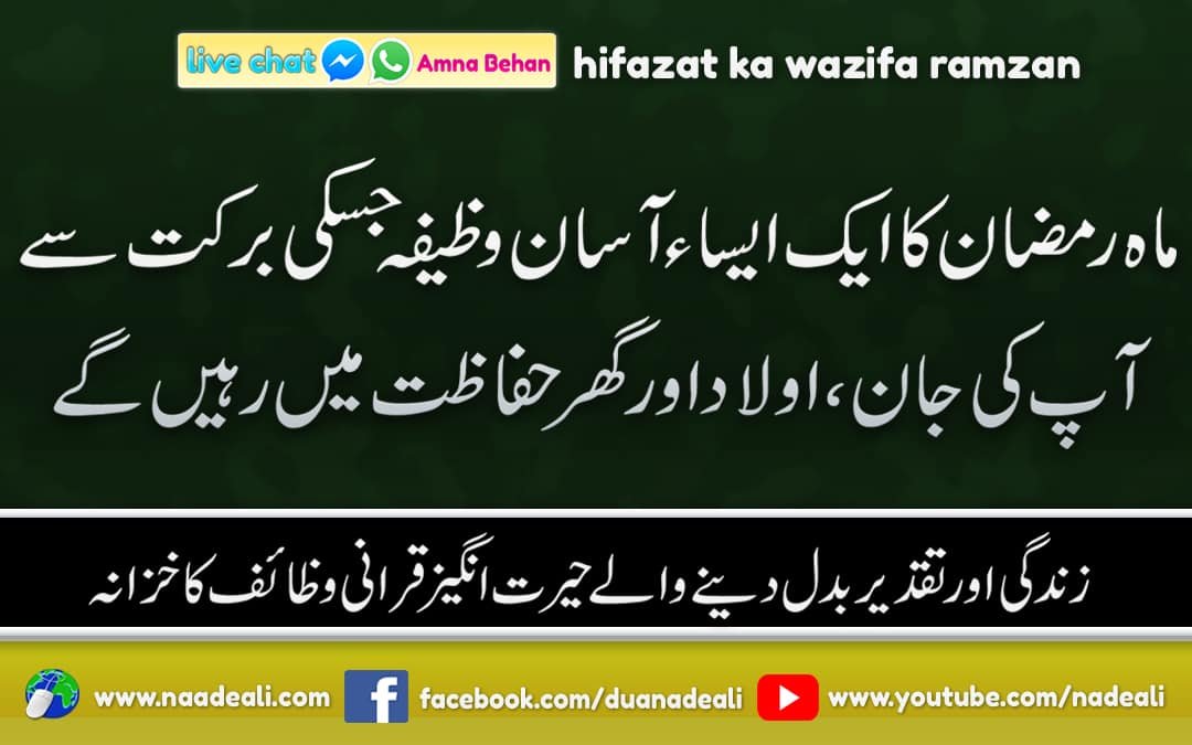 Hifazat Ka Wazifa Agr Ramzan Sharif Me Kiya Jae Tu Es Wazifa Ke Barakat Fard Par Tamam Zindagi Jari Rehti Hain . Lehaza Ager Ap Apni Jan , Aulad , Ghar , Karobar , Izzat , Job Aur Sehat Ki Rohani Hifazat Karna Chahty Hain Tu Aap Mahe Ramzan Mein Ye Khas Wazifa Zaroor Kar Lein . Wazifa Ki Detail Video Mein Mojood Hai .