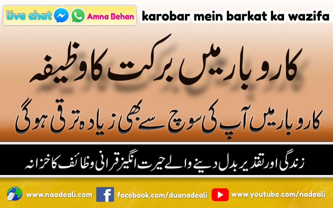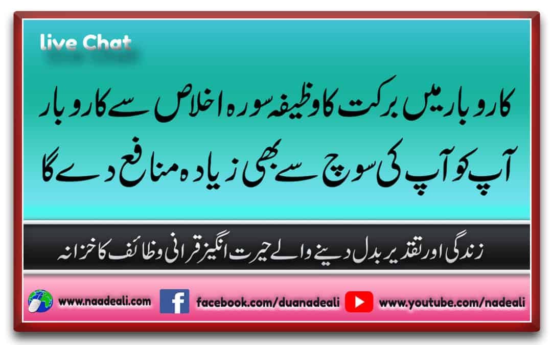 اگر کوئی بھائی ، بہن یا کسی بہن کے شوہر کا کاروبار نہ چل رہا ہو اور اسے مسلسل کاروبار میں نقصان ہو رہا ہو یا وہ کاروباری بندش کا شکار ہیں تو اس کے لئے وہ جمعہ کے دن فجر کی نماز کے بعد اول وآخر 3 -3 مرتبہ درود پاک پڑھیں اور درمیان میں آپ 100 مرتبہ ایاک نعبدوایاک نستعین اور 100 مرتبہ استغراللہ رب من کل ذنب واتوب الیہ ورد کریں یہ عمل آپ نے ہر فرض نماز کے بعد دھرانا ہے اور اس پورے عمل کو آپ نے 14 دن تک کرنا ہے ۔ 14 دن کے بعد آپ عشاء کی نماز کے بعد 10 مرتبہ 100 مرتبہ ایاک نعبدوایاک نستعین اور 100 مرتبہ استغفراللہ رب من کل ذنب واتوب الیہ ورد کرنے کا معمول بنا لیں اور اس میں بلا مجبوری ناغہ نہ کریں ۔ انشاء اللہ صرف چند دنوں میں آپ کا کاروبار آپ کو آپ کی سوچ سے بھی ذیادہ فائدہ دینا شروع کردے گا. اس وظیفہ کی برکت سے آپ کے کاروبار میں جو بھی روکاوٹ ہوگی وہ اللہ کے کرم سے دور ہو جائے گی اور ہمیشہ دور رہے گی ۔