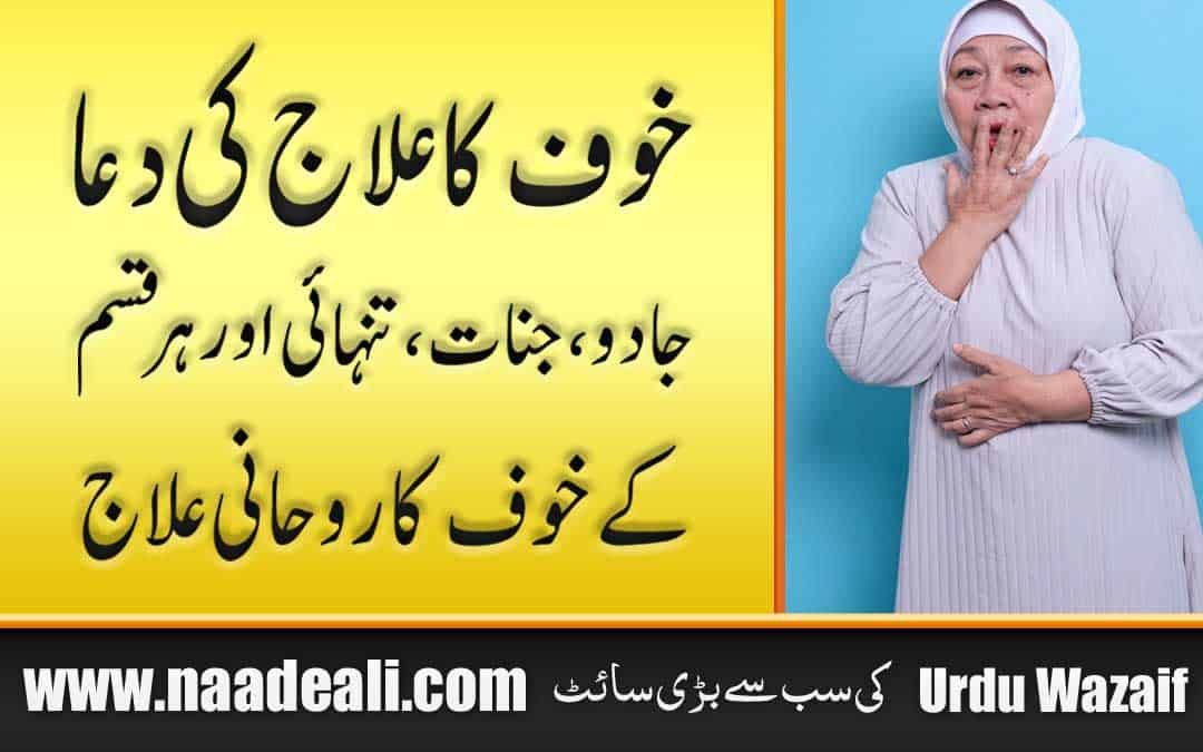خوف سے نجات کے لئے آپ جمعرات کے روز عشاء کی نماز کے بعد اول و آخر 10-10 مرتبہ درود پاک ورد کریں اور درمیان میں آپ دونفل نماز ہدیہ محمد آل محمد اس طرح ادا کریں کہ ان دونوں نوافل میں آپ الحمد شریف کے بعد 14 -14 مرتبہ درود پاک ورد کریں ۔ نوافل ادا کرنے کے بعد آپ 372 مرتبہ آیت الکرسی محبت سے تلاوت کریں ۔ یہ وظیفہ آپ نے ایک ہی دن کرنا ہے اور اس کے بعد آپ نے روزانہ 10 مرتبہ درود ابراہیمی اور 7 مرتبہ آیت الکرسی ورد کرنے کی عادت ڈال لینی ہے ۔ کوشش کریں کہ آپ آیت الکرسی کو پاک سیاہی سے تحریر کرکے اپنے گھر میں بھی رکھیں اور اپنے پاس بھی رکھیں ۔ انشاء اللہ آپ کے خوف کی وجہ جو بھی ہوگی آپ کو ایک ہی دن میں اس سے نجات مل جائے گی ۔ آیت الکرسی کے فضائل برکات کی تفصیل جاننے کے لیے نیچے موجود بٹن پر کلک کریں ۔