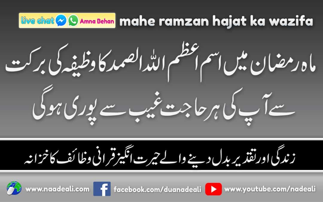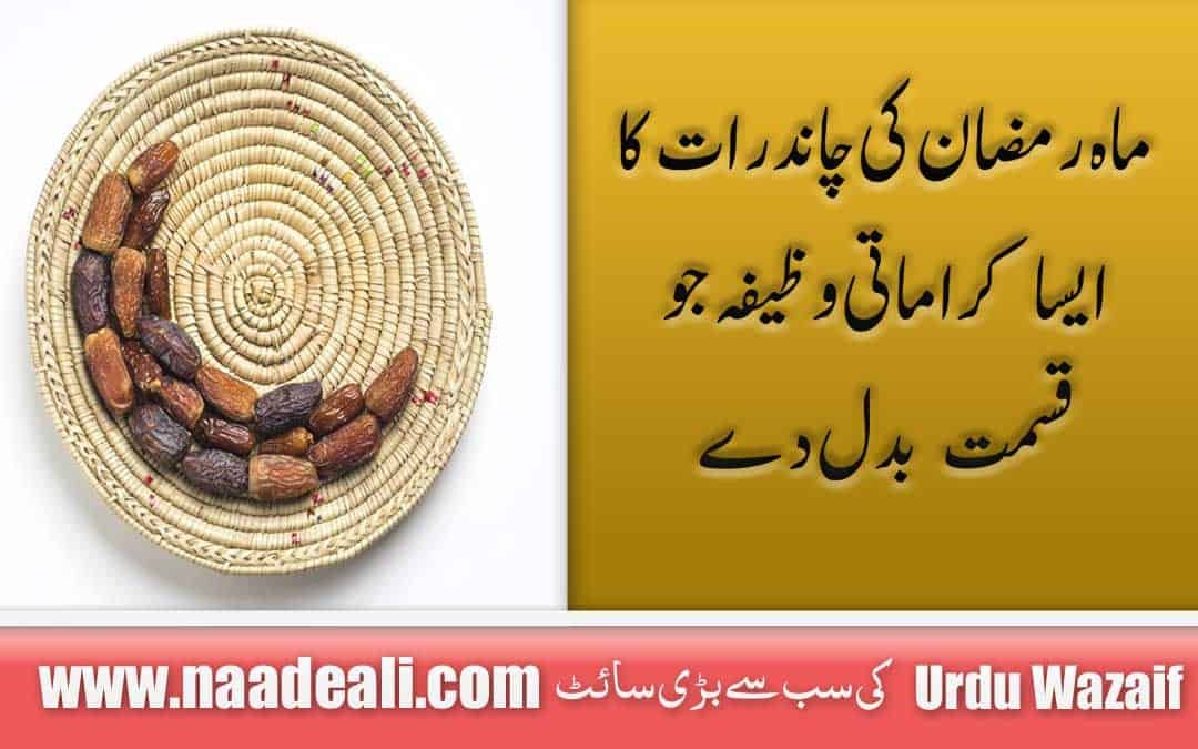 Mah Ramadaan Ki Chaand Raat Mein Duniya Mein Aik Khaas Rohaniyat Ka Nuzool Hona Shuru Hota Hai Jo Ke Poora Maheena Duniya Mein Nazil Hoti Rehti Hai. Yeh Rohaniyat Allah Ke Hukum Se Har Is Fard Ke Muqaddar Ka Acha Kar Deti Hai Jo Ke Mah Ramadaan Ki Chaand Raat Se Le Kar Aakhri Rozay Tak Duroood Salam Aur Quran Ki Tilawat Karte Hain. Is Post Mein Hum Aap Ko Mah Ramadaan Ki Chaand Raat Ke Hawalay Se Aik Aisa Khaas Wazifa Aap Ko Bta Rahay Hain Jiski Barket Se Allah Ki Zaat Aap Ko Aap Ki Tamam Hajat Ghaib Se Aat Farma Dain Ge. Yeh Chhota Sa Wazifa Aap Ko Tamam Zindagi Faida Day Ga Is Wazifa Ki Tafseel Neechay Darj Hai . Mahe Ramzan K Beshumar Wazaif Hasil Karne k lliye Aap Urdu Wazaif Ki Site Naade Ali ko Zaroor Visit kar lain .