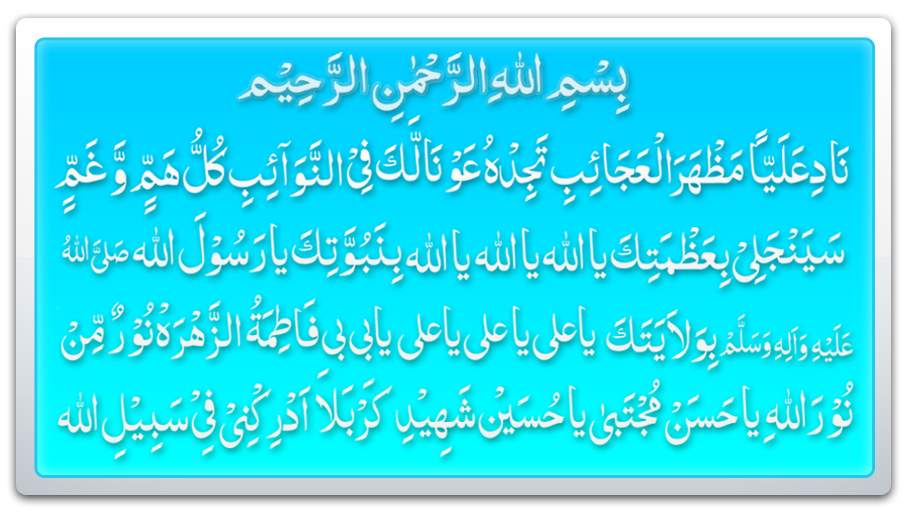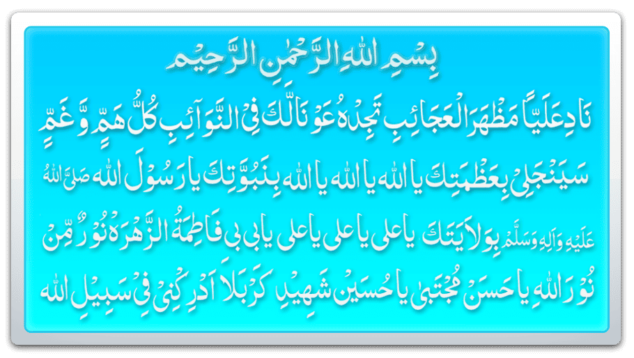 Nazre Bad Se Hifazat Aur Fori Shifa K Liye Har Fard Ko Chahyia K Wo Naqsh Nad E Ali Sharif Apne Ghar Mein Zaroor Rakhe . Naqsh Naade Ali Sharif Ko Ap Mushk , Amber, Zafran Aur Ghulab Se Khud Bhe Tehreer Kar Saktain Hain Iss Khas Naqsh Ka Hadia Kharch Iss Post K Sab Se End Mein Darj Kar Dyia Gyia Hai . Ju K Sirf Mush , Amber , Zafran Aur Corrior Ka Kharch Hai , Astana Ka Zati Hadia Nahi . Iss Naqsh Ko Ap Khud Bhe Mushk , Amber , Zafran Aur Gulab Se Arabi Mein Tehreer Kar Kar Saktay Hai . Agr Koe Bhai Ya Behan Iss Naqsh Ko Astana Se Hasil Karna Chahtay Hain Tu Wo Amna Behan Ko Call Kar Saktay Hain . Ap Ki Request Par Ye Naqsh Ap Ko Courier Kar Diya Jae Gha Ju K 48 Ghanton Mein Ap Ko Wasool Ho Jae Gha . Ap Ne Iss Naqsh Ka Hadia Kharch Courier Boy Ko Ada Kar Dena Hai . Iss Naqsh Ka Hadia Kharch Iss Post K Sab Se End Mein Darj Kar Diya Hai .