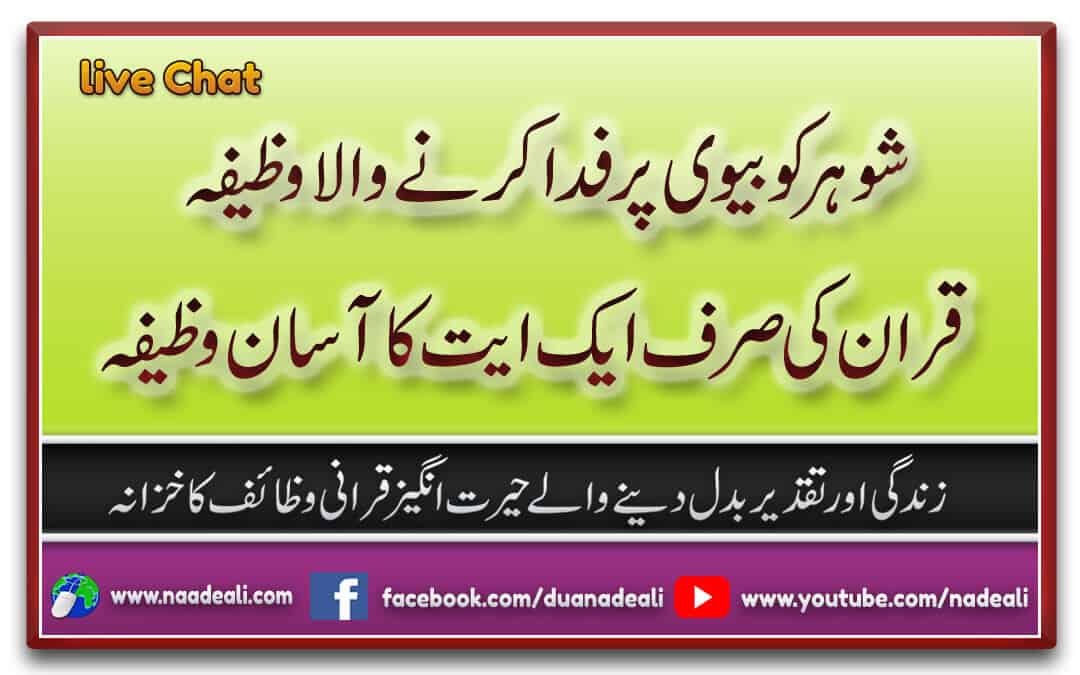شوہر کی محبت حاصل کرنے کےلئے جو وظیفہ سب سے زیادہ پاورفل ہے وہ سورہ اخلاص کا ہے ۔ سورہ اخلاص کا وظیفہ کی برکت سے آپ صرف چند دنوں میں اپنے شوہر کی محبت کو ہمیشہ کے لئے حاصل کر سکتے ہیں ۔ یہ وظیفہ کرنے کے لئے آپ نے جمعہ کے دن فجر کی نماز ادا کرنے کے بعد اول و آخر 3 -3 مرتبہ درود پاک پڑھنا ہے اور درمیان میں آپ نے 100 مرتبہ سورہ اخلاص 7 مرتبہ آیت الکرسی محبت سے ورد کرنی ہے ۔ یہ عمل آپ نے ہر نماز کے بعد کرنا ہے اور اس پورے عمل کو آپ نے 14 دن تک کرنا ہے ۔ انشاء اللہ چند دنوں میں آپ کو آپ کے شوہر کی محبت ہمیشہ کے حاصل ہو جائے گی ۔ یہ وظیفہ شروع کرنے سے پہلے آپ اس وظیفہ کے ہدیہ کی نیت سے کسی ایک مسکین کو اچھا کھانا ضرور کھلادیں ۔اگر کوئی بہن بیان کیا گیا وظیفہ نہ کر سکیں تو وہ جمعہ کے دن سورہ اخلاص کو پاک سیاہی سے عربی میں تحریر کرکے اپنے گھر میں بھی رکھیں اور اپنے پاس بھی رکھیں ۔انشاء اللہ جلد ہی اللہ کی ذات میاں بیوی کے درمیان محبت پیدا فرمادیں گے۔ سورہ اخلاص کی برکت سے میاں بیوی کے درمیان نہ ختم ہونے والی محبت پیدا ہو جاے گی اور ان پر کسی قسم کا کالا جادو اثر نہیں کر سکے گا نقش سورہ اخلاص آپ 5 مساکین کو کھانا کھلا کر آستانہ سے فری حاصل کر سکتے ہیں ۔