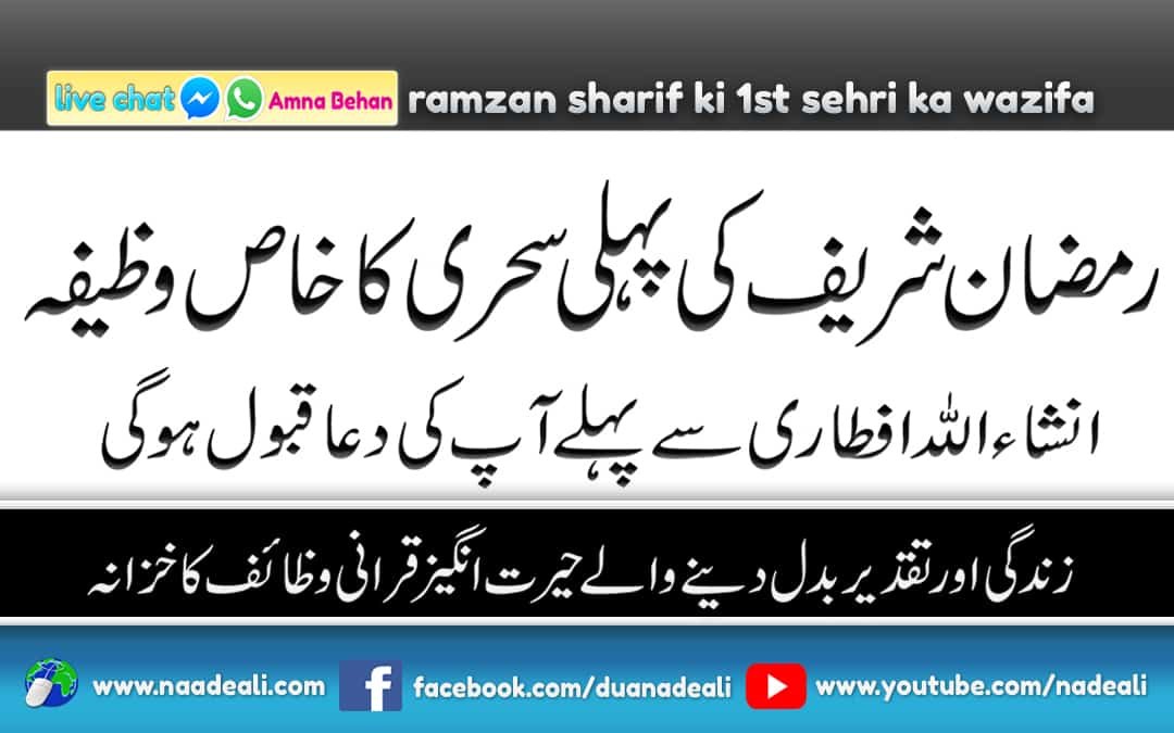 Ramzan Sharif Ki 1st Sehri Ka Wazifa Aap ki Kismat , Halat Aur Har Nakami ko Kamyabi mein badal De ga . Ye Chota Se Wazifa Hai likan Iss ki Rohani Barakat Insani Sooch Se Bhe Zaida Hain . lehaza Ramzan Sharif Ki 1st Sehri Karne k Baad Aap 10 Bar Duroode Ibrahmi , 10 Bar 3rd Kalma Aur 1 Bar Surah Mulk Zaroor tilawat kar lein . Iss k Baad Aap Apne Hajat Allah ki Barghah mein Peesh krain , Insha Allah Aap ko Aap ki Har Hajat Sirf Chand Dino mein Hasil ho jae ghe .Ramzan Sharif Ki 1st Sehri Ka Wazifa ki Urdu Detail Nechay Darj Hai .Iss k ilawa Ramzan Sharif Ki 1st Sehri Ka Wazifa K Hawalay Se Agr Aap Ko Mazeed Detail Darkar Hai Tu Aap Urdu Wazaif Ki Site www.naadeali.com ko Visit krain .