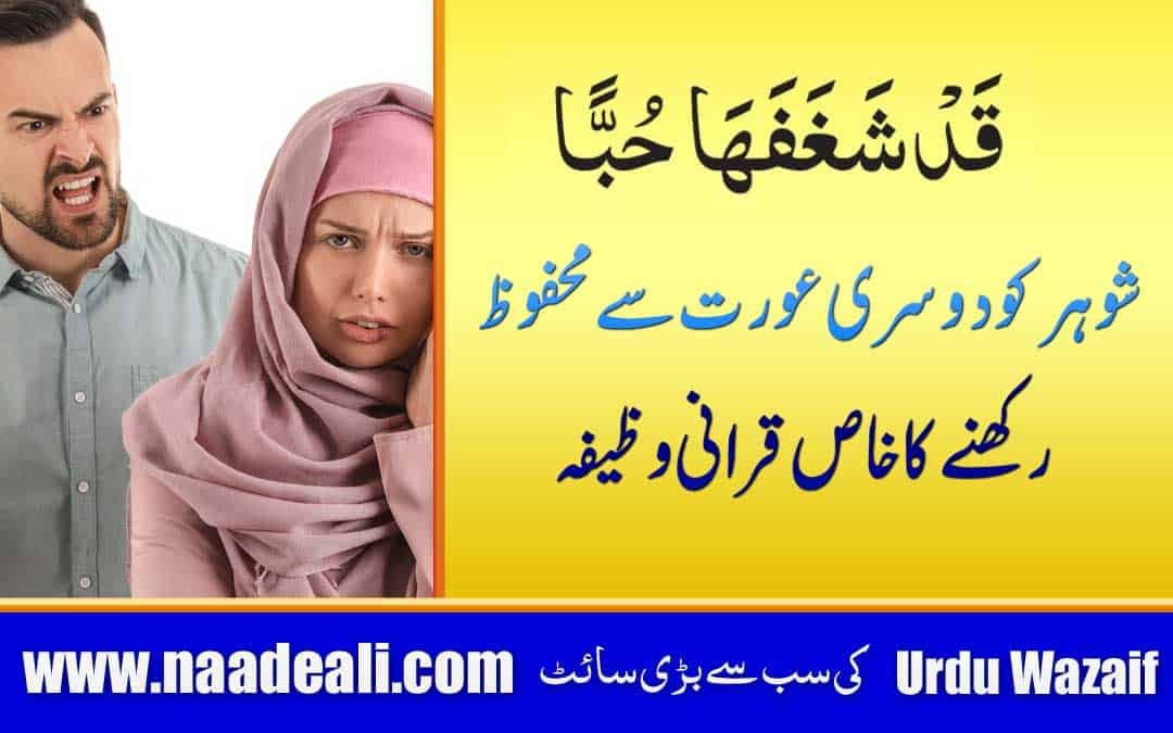 Shadi ke baad aksar shoharon ki mohabbat apni biwi ke liye bohat kam ho jaati hai. Shohar ki iski biwi ke liye mohabbat kam hone ki bohat si wajahat ho sakti hain, aisi wajahat mein shohar ki doosri aurat se mohabbat hai. Yani aksar shohar ghair aurat ki mohabbat mein mubtala ho kar apni biwi se door ho jatay hai. Shohar ki kisi aurat ki mohabbat mein mubtala hone ki wajah qudrati bhi ho sakti hai aur iski wajah kala jadoo bhi ho sakta hai. Aksar dekha gaya hai ke baaz auraton ko shadi shuda mardoon mein dilchaspi hoti hai. Is liye aisi auratein aise shoharon ko hasil karne ke liye in par kala jadoo karti hain. Is liye kala jadoo agar kisi shohar ke dil par asar kare to iski wajah se shohar ghair aurat ko hasil karne ke liye apna aap tabah bhi kar sakta hai.Yaad rahe ke kala jadoo se mutasir shakhs ke paas baithne se fard par kala jadoo ke kuch na kuch asarat murattab ho jaate hain jabke kala jadoo ka asar ki wajah se shakhs ko ghair aurton se mohabbat hone lagti hai. Is liye aisi soorat mein jo khawateen jadoo se mutasir shakhs ko muskurakar dekhti hain, yeh shakhs usi khatoon par shadeed aashiq ho jata hai aur is tarah fard ki zindagi mein be sukooni paida ho jati hai. Yaad rahe ke kala jadoo jis zariye se bhi fard ko mutasir karta hai uski wajah se fard ko ghair aurton se mohabbat hone lagti hai. Is liye is post mein hum aapko ek aisi dua batane ja rahe hain jiski barkat se aap apne shohar ko har ghair aurat se door rakh sakti hain aur is ke ilawa aap apne shohar ke dil mein apni mohabbat bhi hamesha ke liye paida kar sakti hain. Is dua ki tafseel niche darj hai.