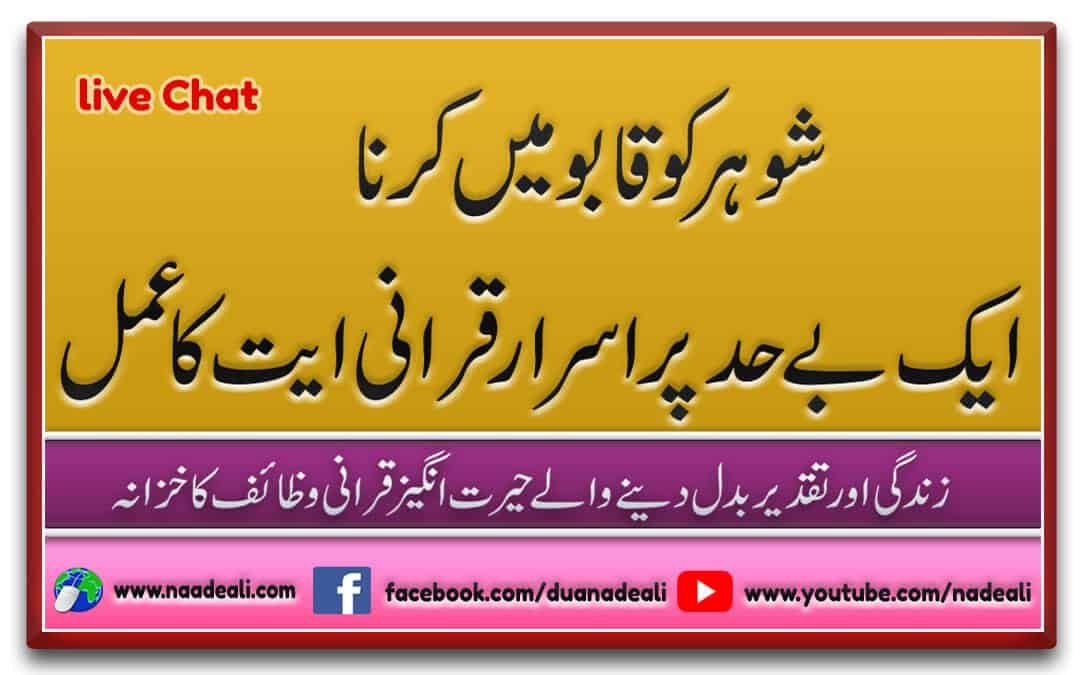 Shohar ko kabu karna asan nahi magr jes behan k pas qurani ayat ka arabi naqsh mojod hai es k liye shohar se apni har jayiz baat manwana mushkil nahi . Es ayat ka arabi naqsh shohar k hawalay se har pareshani ka fori rohani hal hai . Ye ayat husband wife me be had mohabbat paida karne ka aik aysa secret hai ju aap ko hamari site k ilawa kahe se hasil nahi hi gha . Es ayat mobarka ka arabi naqsh apne ghar me jes shadi shuda behan ne rakh lia wo tamam zindagi apne ghar me khush rahe ghe . Lahaza agr koe behan apnay shohar se apni har baat manwana chahti hai aur apnay shohar ki mohabbat bhe dekhna chahti hai tu wo biyaan ki gye ayat mobarka ka arabi naqsh apnay ghar me zaroor rakh lay .