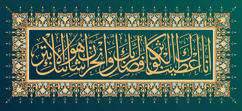(اے پیغمبر) یقین جانو ہم نے تمہیں کوثر عطا کردی ہے۔ لہٰذا تم اپنے پروردگار (کی خوشنودی) کے لیے نماز پڑھو، اور قربانی کرو۔ یقین جانو تمہارا دشمن ہی وہ ہے جس کی جڑ کٹی ہوئی ہے۔