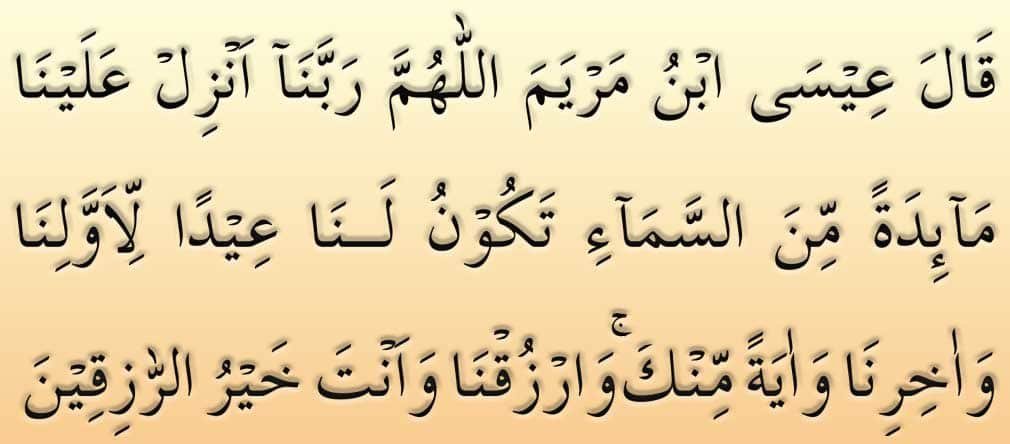 سورہ مائدہ ایت 114 حضرت عیسی علیہ سلام کی دعا ہے جس میں آپ عیسی علیہ سلام نے اللہ سے رزق کے لئے دعا کی ۔